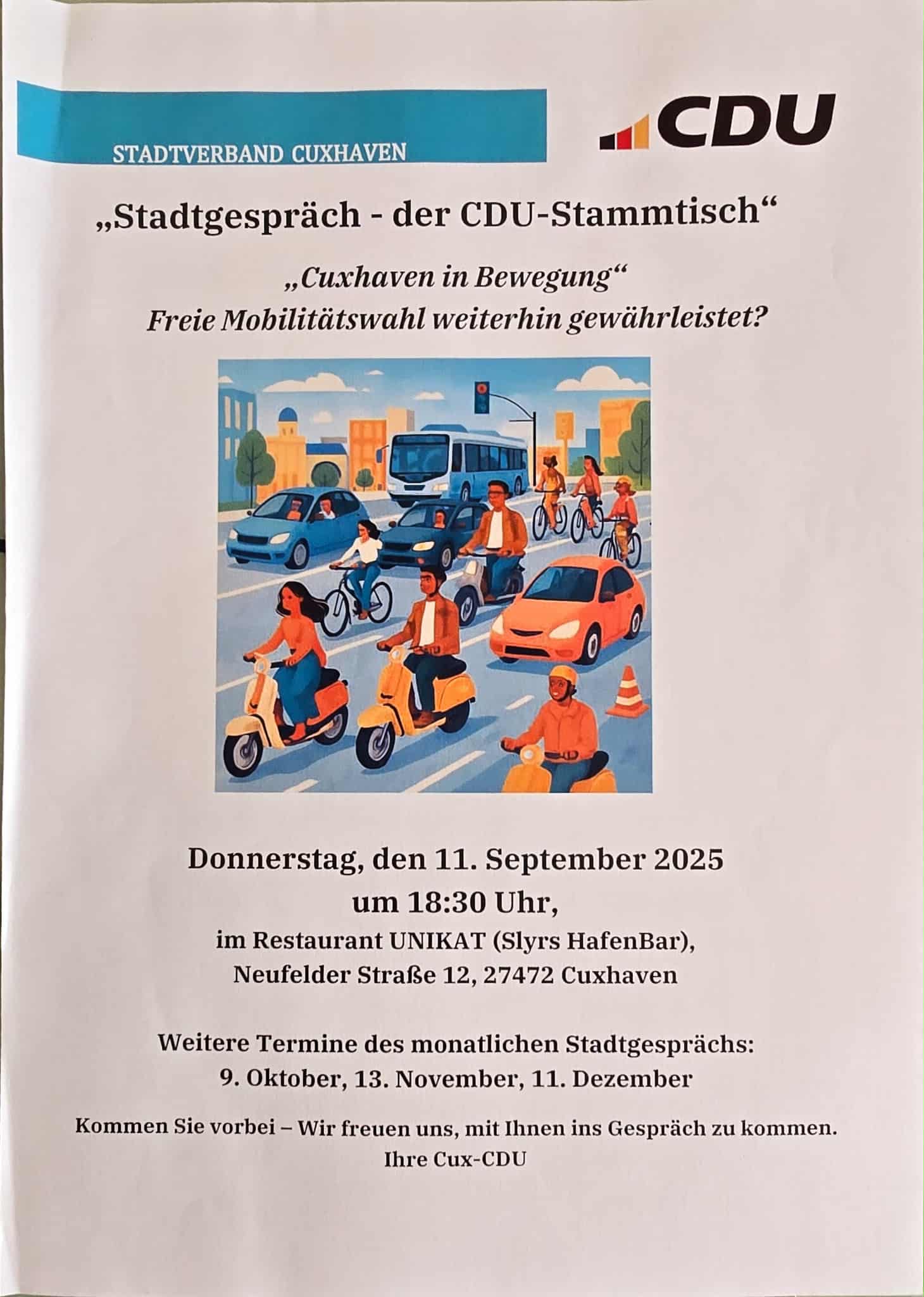 Donnerstag waren wir im „Unikat“zum Stammtisch „Stadtgespräch“des CDU Stadtverband Cuxhaven ,unter dem Thema „Gesundheit in Cuxhaven-Wie kann die medizinische Versorgung auch in Zukunft sichergestellt werden“.